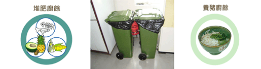 將廚餘分類,由合格之廠商派專人及回收車,送往畜牧養豬場或製成堆肥,做回收處理 。
